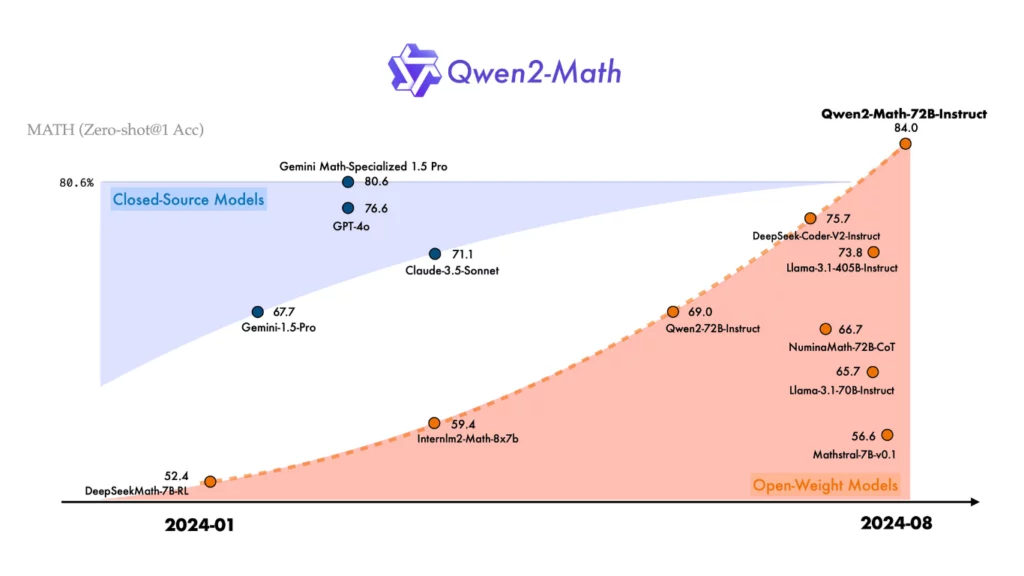 In benchmarks such as GSM8K, Math, and MMLU-STEM, the largest model, Qwen2-Math-72B-Instruct, has outperformed GPT-4, Claude-3.5-Sonnet, Gemini-1.5-Pro, and Llama-3.1-405B.